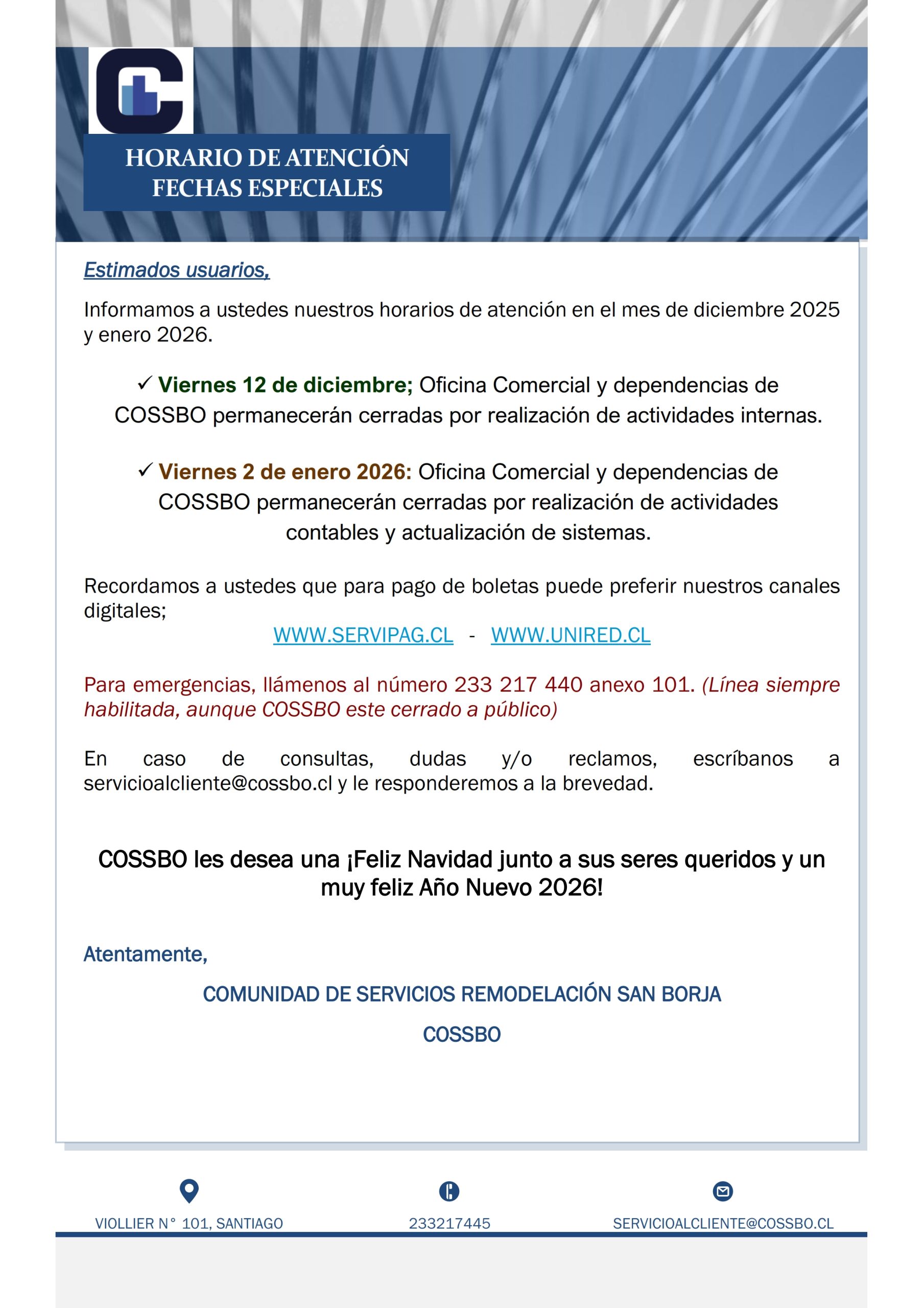 - COSSBO informa a sus propietarios, usuarios, clientes y público en general que su Directorio está en un proceso conducente a implementar el cobro de un tipo de gasto común para la mantención y modernización necesaria de la capacidad instalada, de tal manera de poder asegurar la calidad y continuidad de los servicios que presta a la Comunidad.